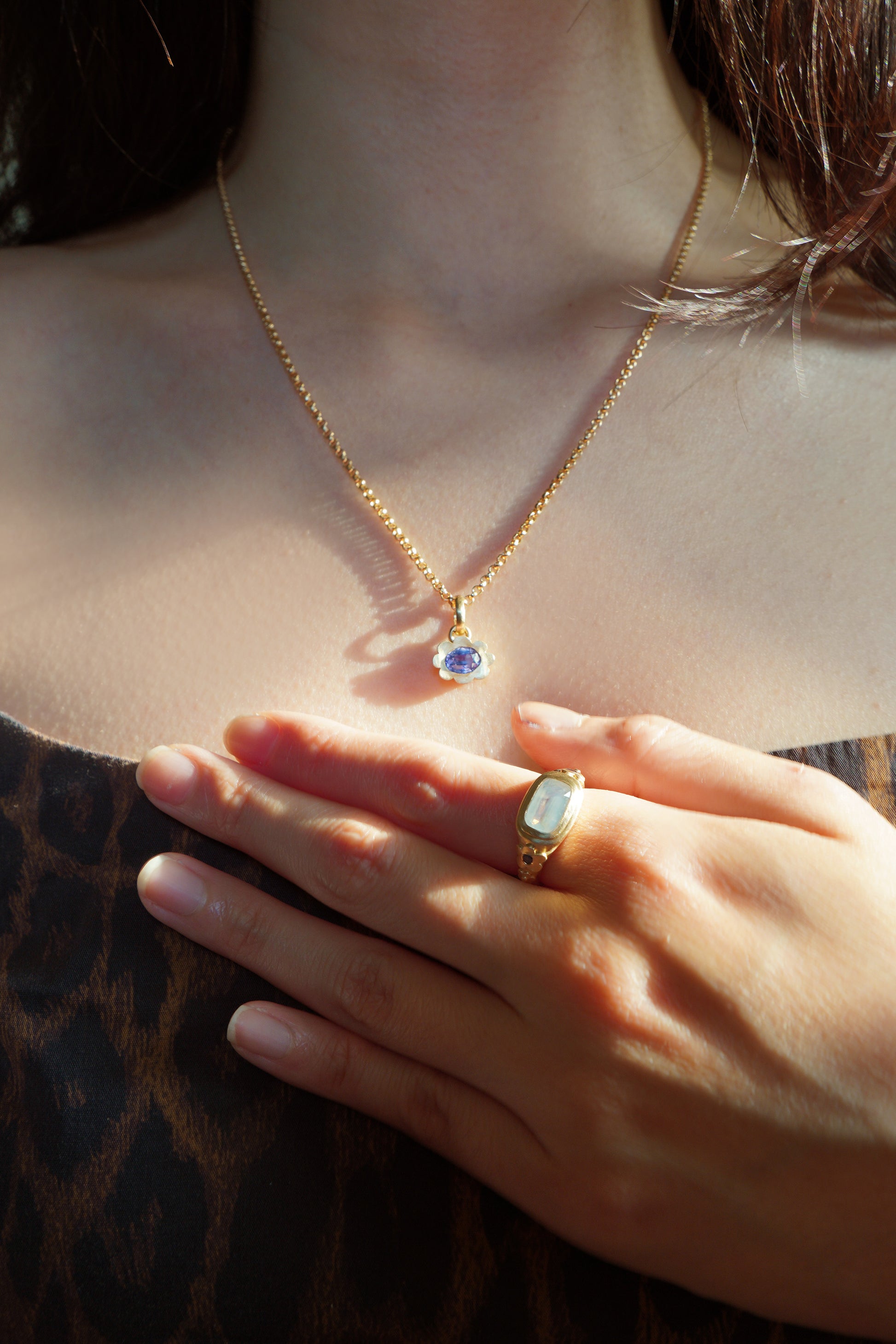 - 14k solid gold set with a 1.4ct untreated Sri Lankan opalescent sapphire that glows purple to pink.