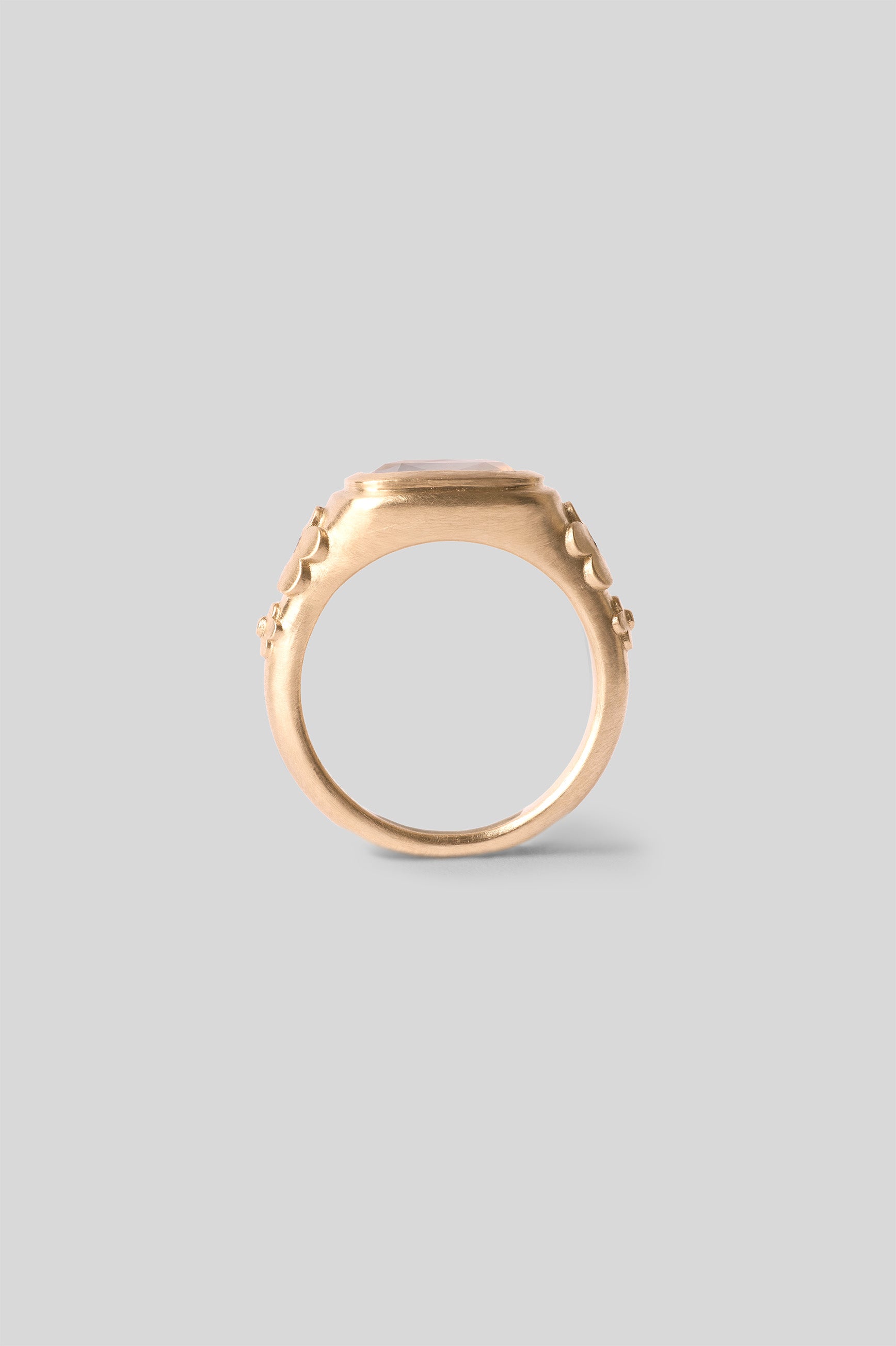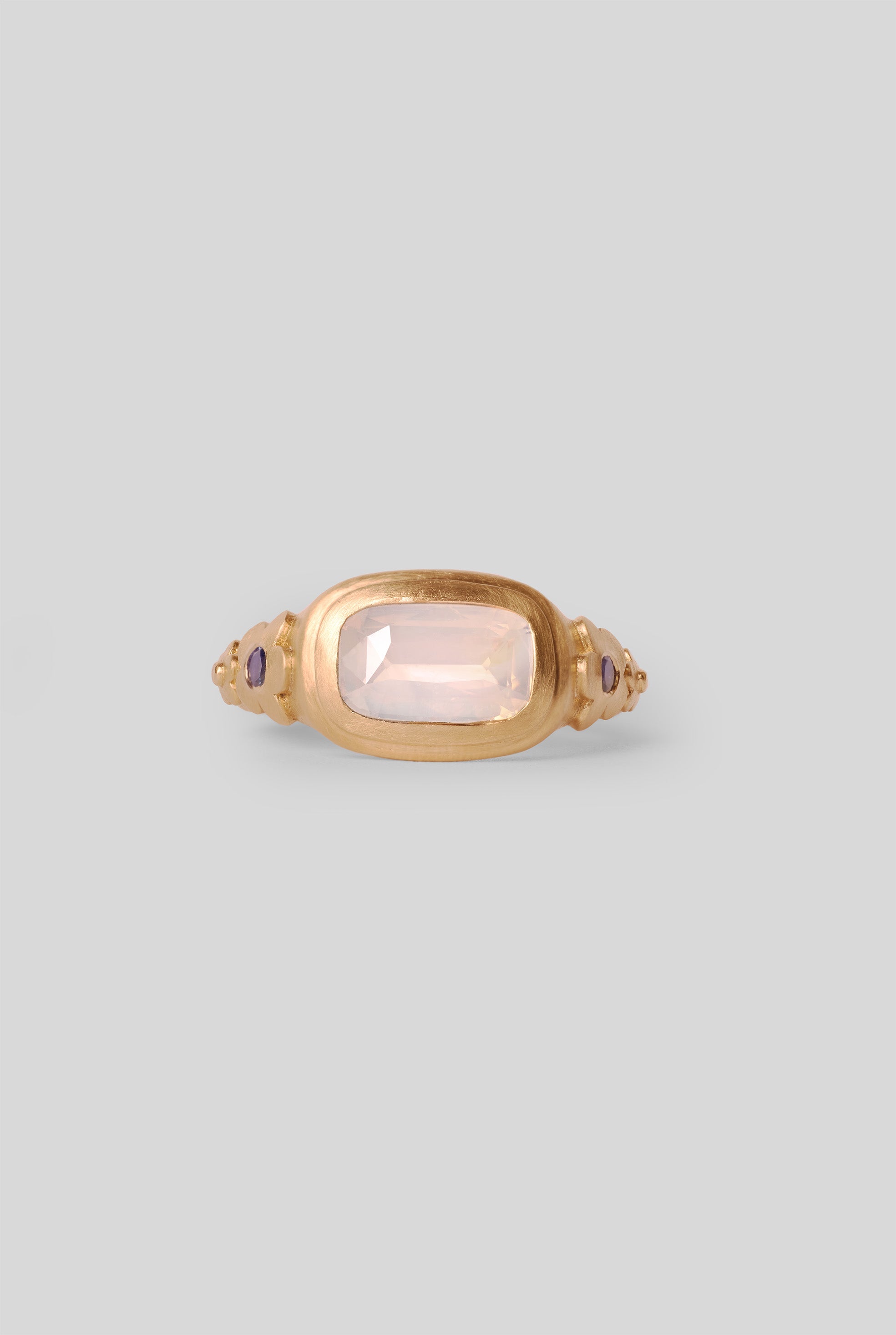 - 14k solid gold in US 6.5 set with a 2ct cushion-cut, untreated Sri Lankan opalescent sapphire and two heated blue sapphire melee.