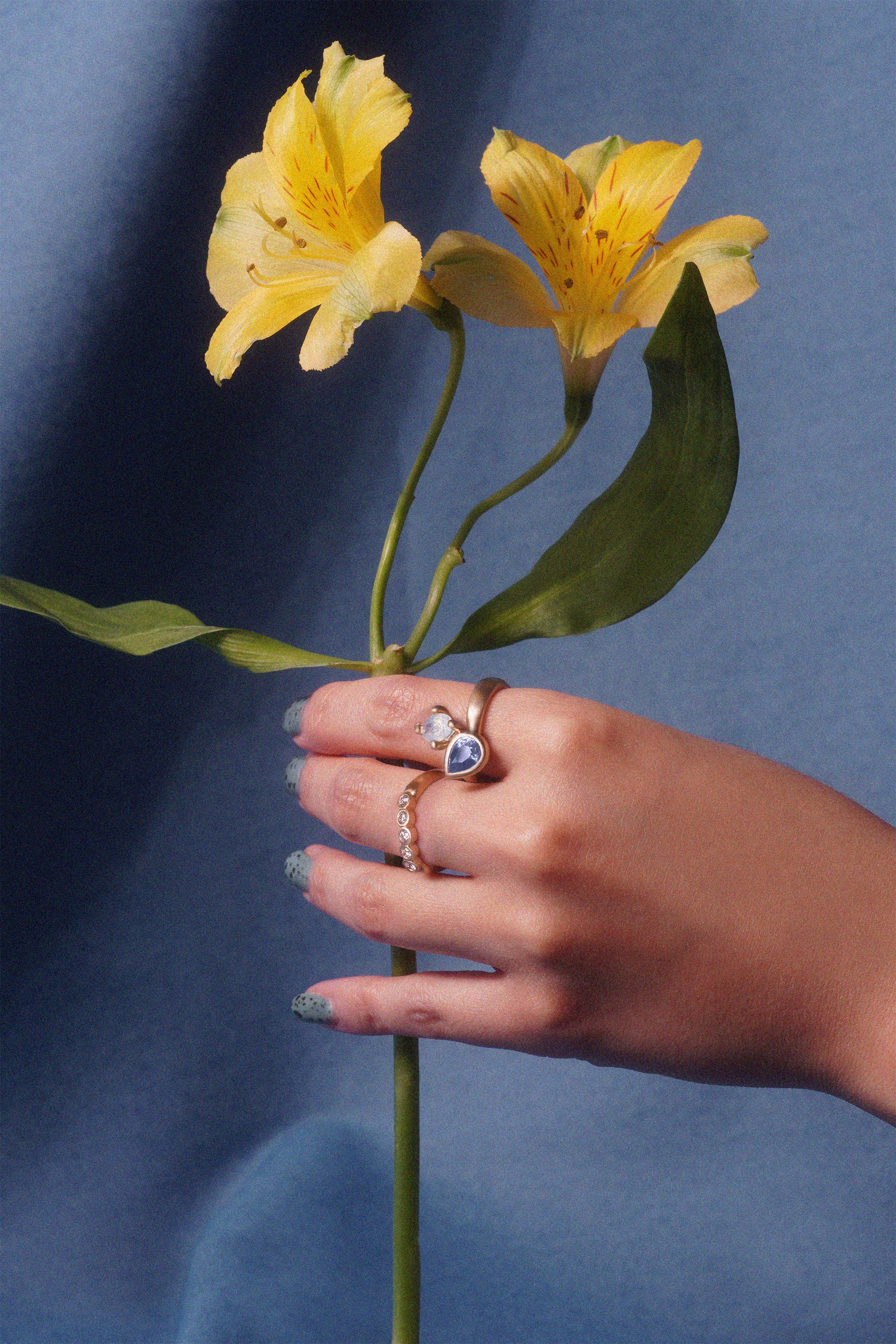 - Set with a 1.65ct natural opalescent pear blue sapphire and 1.61ct opalescent white sapphire.