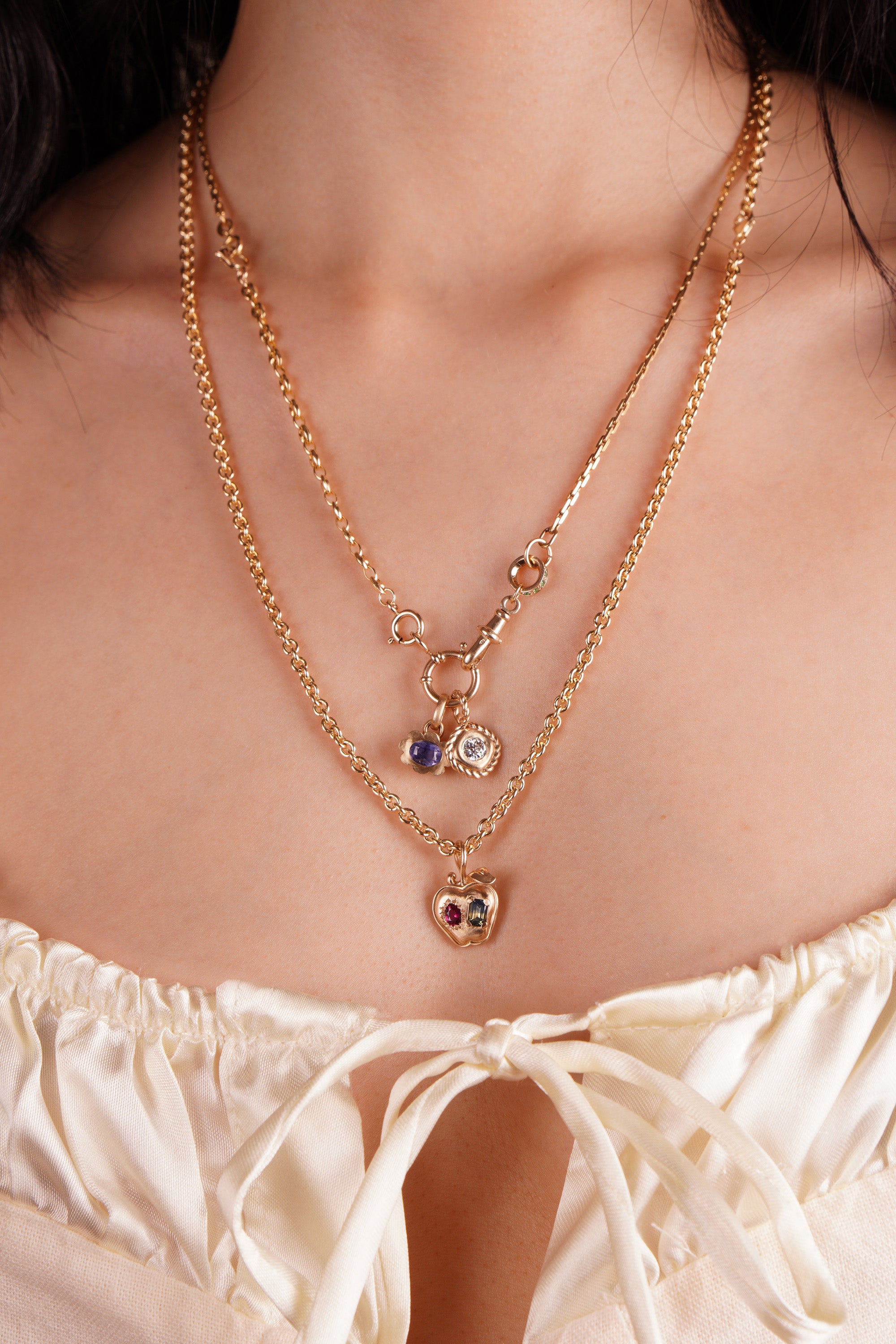 - A comforting, stuffed-ravioli form with a gentle, familiar warmth. A noodly bail wraps around the cushiony gold shape in an easy, organic embrace.